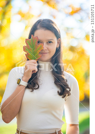 Portrait of young woman holding autumn leaf in her hands while standing in park, calm seasonal atmosphere and natural beauty during fall