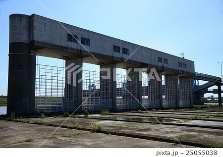 増水のためスルースゲート・扉が下ろされて、水流が止められている水門