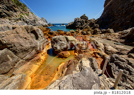 式根島の地鉈温泉のオレンジ色の岩場