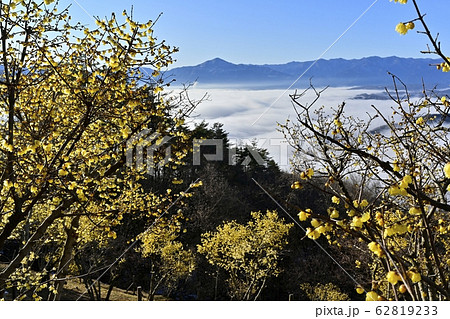 宝登山ロウバイ園のロウバイと秩父盆地を覆う雲海に武甲山と秩父の山々