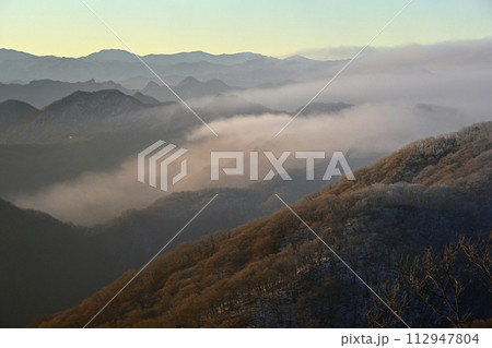 軽井沢旧碓氷峠見晴台から霧と霧氷着く山に西上州・奥秩父の山々