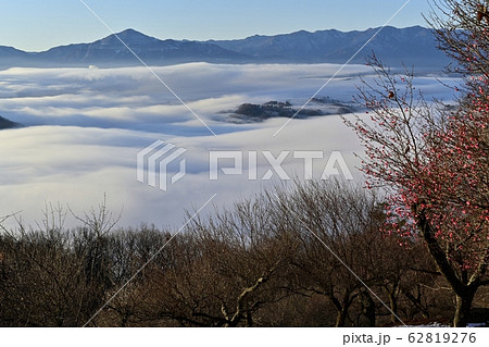 宝登山梅園の紅梅と秩父盆地を覆う雲海に武甲山と秩父の山々