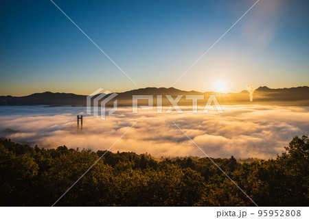 晴れた早朝に雲海が掛かる秩父公園橋のある風景