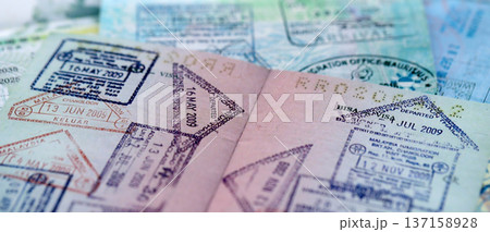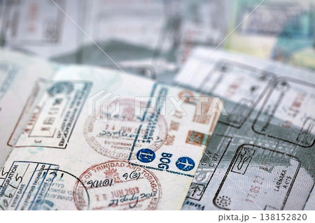 Big amount of passport pages full of colorful stamps after travel and border crossing. Tourism and border control concept. Immigration and travel around the world