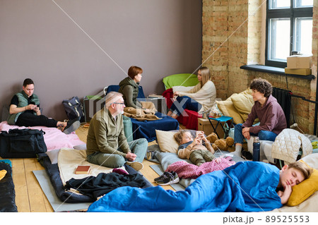 Young woman talking to mature man while both sitting on sleeping places