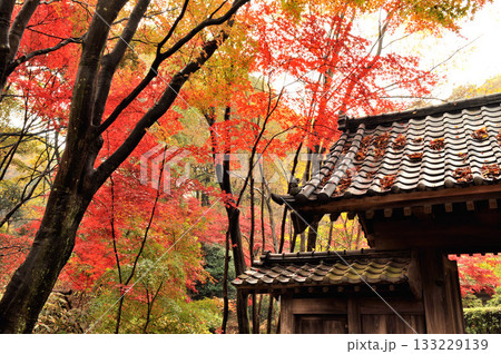 東京都町田市野津田薬師池公園の古民家の門と紅葉
