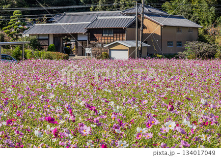 磐田市の向笠のコスモス畑と加賀爪甲斐守屋敷移築門の風景(静岡県)