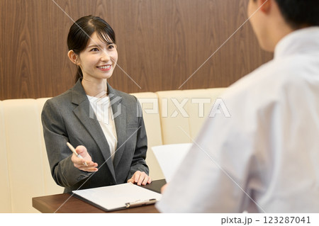 飲食店で営業をするビジネスウーマン