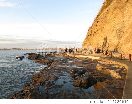 江ノ島岩屋近くの稚児ヶ淵(ちごがふち)で夕陽を眺める人 夕景