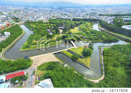 日本 北海道函館市にある五稜郭タワーから見える五稜郭公園と街並み