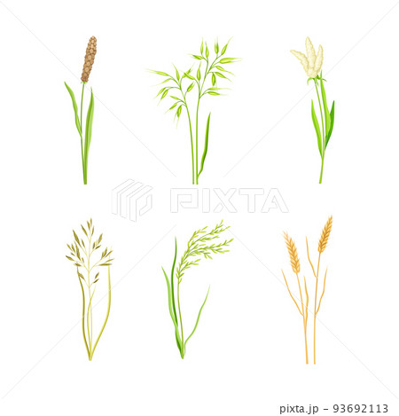 Grain Crop or Cereal Species as Cultivated Grass on Stalk with Inflorescences Vector Set