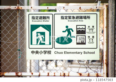 小学校の壁面にある避難場所を示す看板