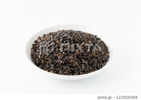 お皿に入った玄そば(殻つきのそばの実)