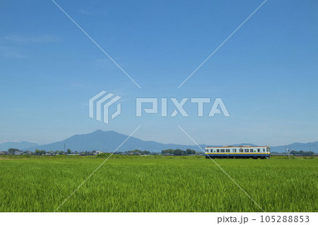 飯豊連峰を背景に会津盆地を走る只見線の列車キハE120形(福島県会津坂下町、5月下旬午前)
