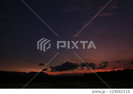 Late twilight view of a flooded rice field under a darkening sky. Clouds drift across deep purple and orange hues, with silhouettes of hills and trees adding a calm, moody atmosphere.