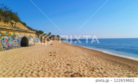 A serene beach with a mural-adorned former military bunker on golden sands offers a unique history blend.