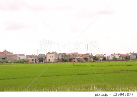 Rice fields in Vietnam. There are green rice fields in the field. Farmers work on them. In the background are villages and country roads