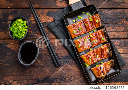 Japanese grilled eel with sweet soy sauce . wooden background. top view