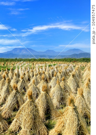 岩手 奥州市 収穫時期の田園風景と稲わら干し(ほんにょ)