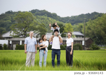 後姿 故郷に帰省した三世代家族の集合写真 田舎のあぜ道で撮影