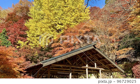 カラフルな紅葉とあずま屋〈大井平公園/愛知県豊田市稲武町〉