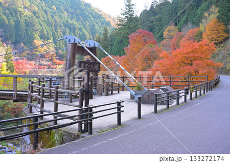 秋晴れの青空に映える紅葉と吊り橋(風のかけ橋) 〈大井平公園/愛知県豊田市稲武町〉