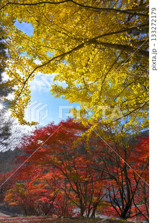 秋晴れの青空に映える紅葉〈大井平公園/愛知県豊田市稲武町〉