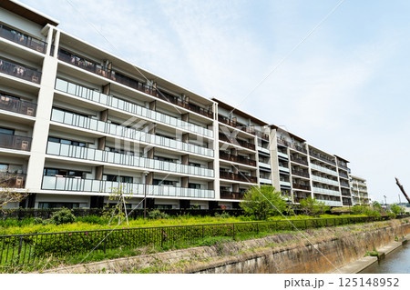 稲生橋から見たプラウド向ヶ丘遊園 春の青空 神奈川県川崎市多摩区登戸