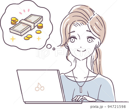 ノートPCでお金を稼ぐ女性のイラスト素材 在宅ワーク 副業 リモート パソコン