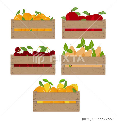 Wooden box set with fruits, Case with orange, lemon, apple, pear and cherry isolated on white background. Vector illustration