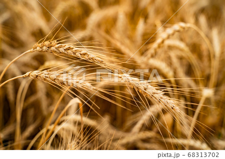 Wheat. Wheat field. Golden wheat field and sunny day. Flour. Ears of wheat on a background of the field. Shallow depth of field. Countryside landscape.