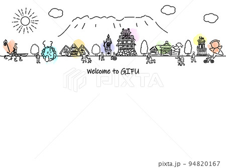 岐阜県の観光地の街並みと人々のシンプル線画イラスト