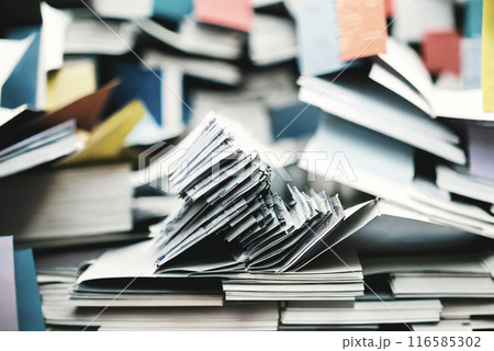 積みあがった書類ファイル(山積みの仕事・書類整理・事務作業イメージ)