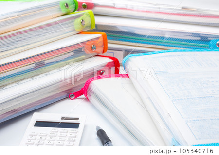 山積みの書類ファイルと電卓とボールペン(事務作業・学習イメージ)