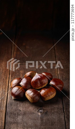 Bunch of Chestnuts on Wooden Planks with Copy Space