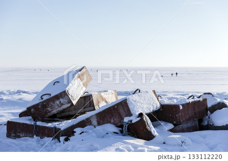 Snow covered concrete blocks lie piled along a frozen sea shore