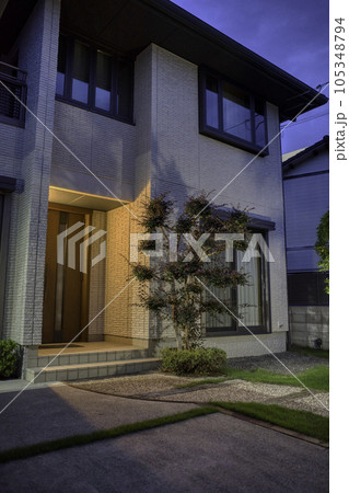 小さな庭のある一戸建ての住宅 夜景 perming 写真素材