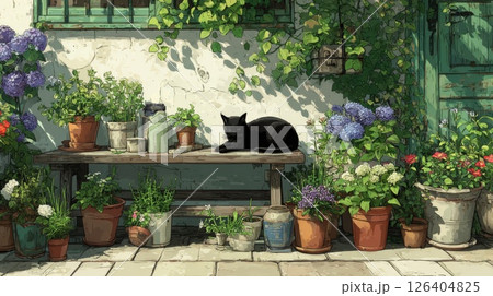 Black Cat Resting on Bench Among Blooming Flowers in Sunny Garden