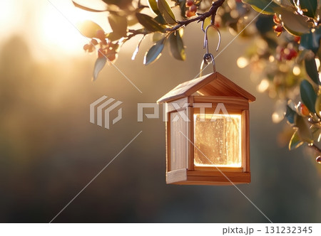 A small, wooden bird feeder hangs from a branch, bathed in the warm glow of the setting sun