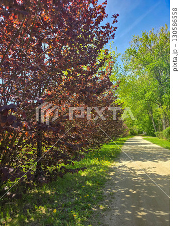 春の公園で散歩するシニア女性の姿と新緑の森の風景