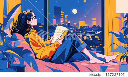 ブランケットに包まれて本を読む女性の夕暮れ写真