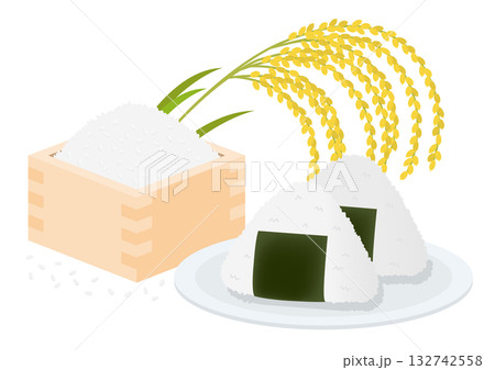 升に入った白米と稲穂と皿に乗ったおにぎりのイメージイラスト