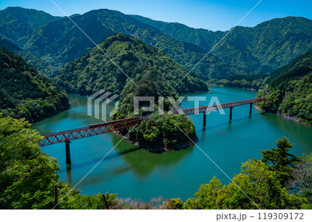 静岡県大井鉄道、新緑の奥大井湖上駅に停車している列車、鉄道ファンに人気の美しい風景