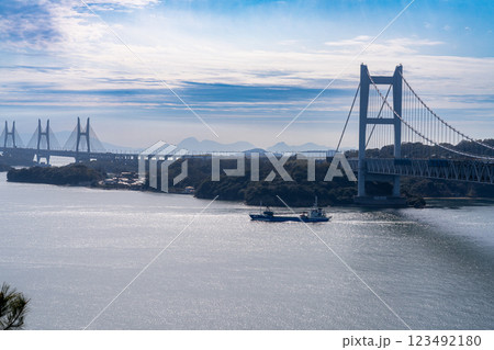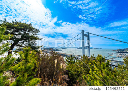 早春の穴場稲荷神社から見た下津井大橋と櫃石島橋 岡山県倉敷市