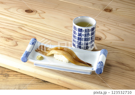 お皿の上に盛り付けられた炙り煮穴子の一本握りとお茶