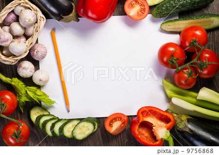 Vegetables tiled around a sheet of paper