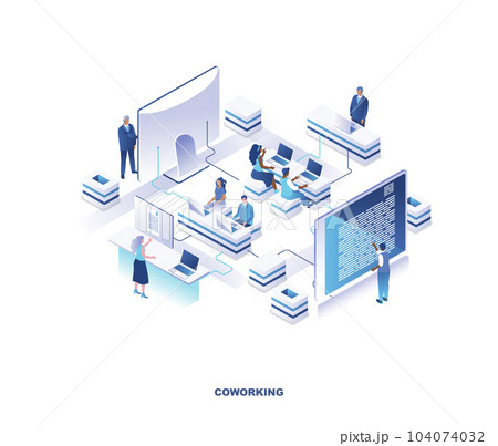 Coworking place or shared office isometric scene. Concept with employees, managers or clerks sitting at desks and working on laptop computers in open space. Vector illustration for website.