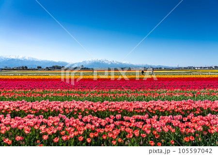 富山県入善町 にゅうぜんフラワーロード2023のチューリップ畑と残雪の北アルプス