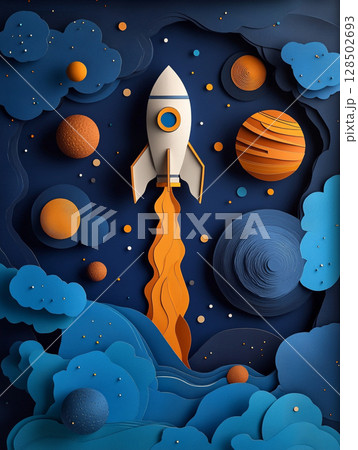A stylized paper-cut illustration depicts a white rocket launching from orange clouds, surrounded by planets and stars against a deep blue space background.