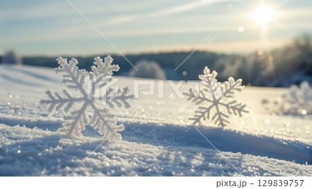 Sparkling snowflakes under bright sunlight create serene winter scene